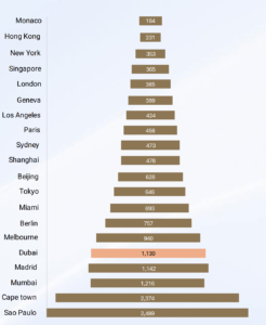 $1 milyon ABD doları ile alıcılar Dubai'de Londra, New York veya Singapur gibi şehirlerden üç kat daha fazla olan yaklaşık 130 metrekarelik birinci sınıf konut alanını güvence altına alabilir ve bu da dünyanın zenginleri arasındaki talebi artırır. |